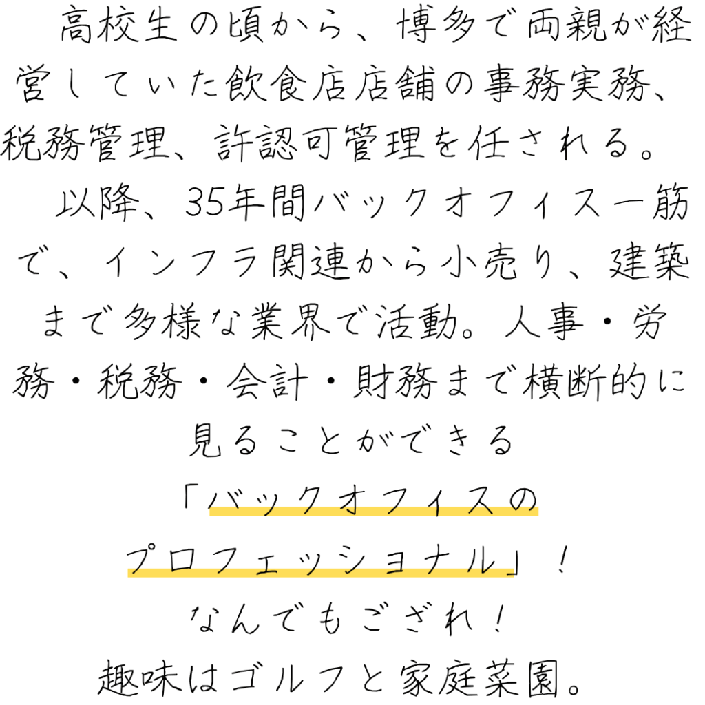 毎月の仕分け入力、試算表の作成、人事管理、採用面接、給与計算、労務管理、求人票作成、スカウトメール対応、面談調整、経費精算、勤怠管理、入社手続き、経理記帳、請求書・領収書発行